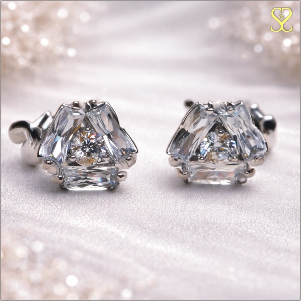 Make a bold yet elegant statement with these stunning 92.5 Sterling Silver Designer Cluster Stud Earrings. Featuring a unique triangular arrangement of baguette and round-cut stones, these earrings create a dazzling multi-dimensional sparkle that instantly elevates your look.