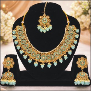 The finely crafted necklace sits beautifully on the neckline, while the matching earrings add a touch of sparkle to your overall look. Whether you’re attending a wedding, a festive celebration, or a special evening event, this set ensures you stand out effortlessly.