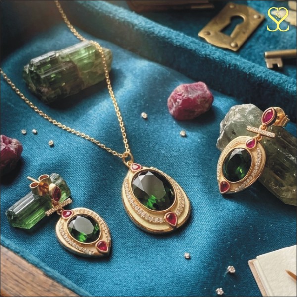 This bold emerald-tone pendant and matching earrings blend luxury with modern design, giving you that rich, high-fashion vibe. Designed for women who love to shine without saying a word.