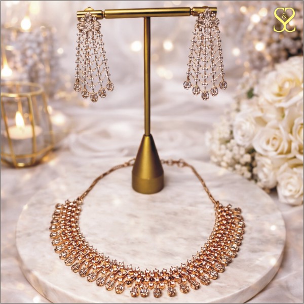 Upgrade your jewelry collection with this stunning rose gold plated necklace set designed to make a statement. Featuring a beautifully detailed choker necklace adorned with shimmering crystal drops, this set exudes elegance and sophistication.