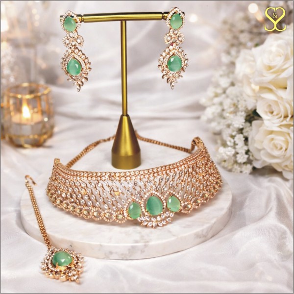 Rose Gold Plated Green Stone Jewelry Set for Women | Choker Necklace with Earrings & Maang Tikka | Bridal & Party Wear Jewellery