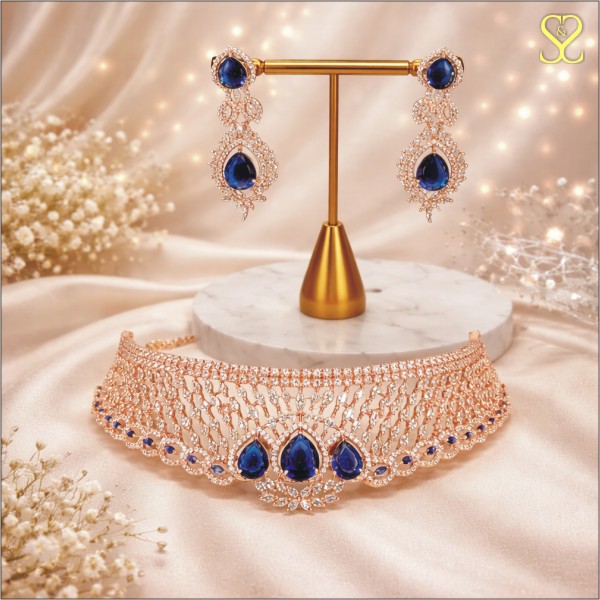 Royal Blue Stone Choker Necklace Set for Women | Rose Gold Plated CZ Diamond Bridal Jewellery Set with Earrings | Wedding & Party Wear