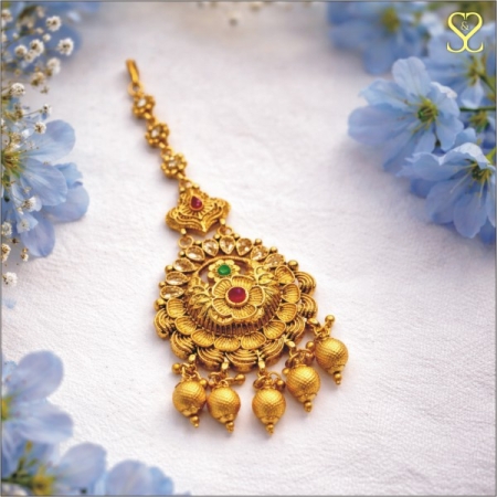Enhance your ethnic elegance with this beautifully crafted gold-plated maang tikka, designed to add a royal touch to your festive and bridal look. Featuring intricate detailing, vibrant red and green stones, and a classic circular pendant design, this piece perfectly blends tradition with modern charm.